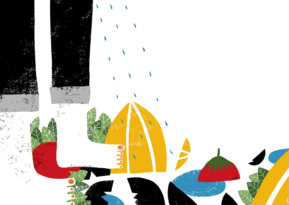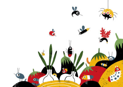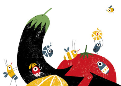 “A Horrifying Idea” (Una idea horripilante) is an unpublished children’s book project that explores the humorous and whimsical world of its protagonists. The visual narrative is built on bold silhouettes and a vibrant palette of yellow, red, and black. My focus was on creating expressive characters and a detailed natural world where insects and vegetables take on a life of their own. This project serves as a comprehensive example of my ability to develop a complete visual universe for narrative publishing.