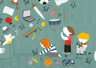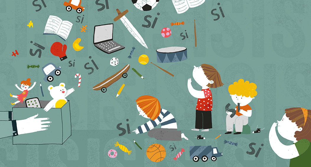 Created for Il Corriere della Sera’s “Tempi Liberi” section, this artwork accompanies an article discussing alternative educational methods where traditional punishment is replaced by a more affirming approach. The illustration features a vibrant, busy scene of children playing, surrounded by toys and a rhythmic background repetition of the word “Sì” (Yes). This project showcases my ability to visually interpret complex pedagogical themes, creating engaging scenes that balance social observation with a joyful, textured aesthetic.