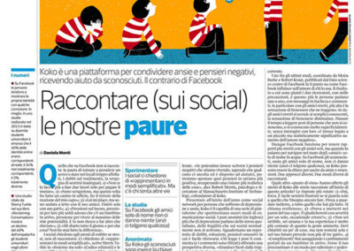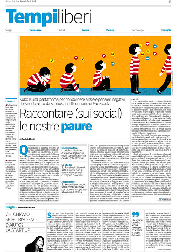 Commissioned by Il Corriere della Sera for its “Tempi Liberi” section, this illustration accompanies an article on “social therapy”—the act of sharing fears and anxieties online to find community support. The artwork features a linear progression of characters, moving from a dark, isolated state on the left to a vibrant, connected interaction on the right, punctuated by digital social icons. This piece highlights my ability to translate complex psychological states into relatable and conceptually sound editorial art for top-tier European media.