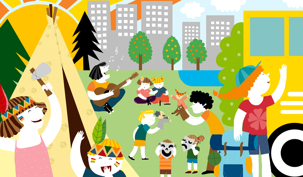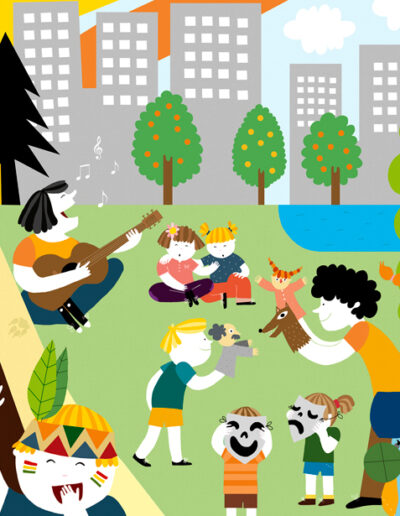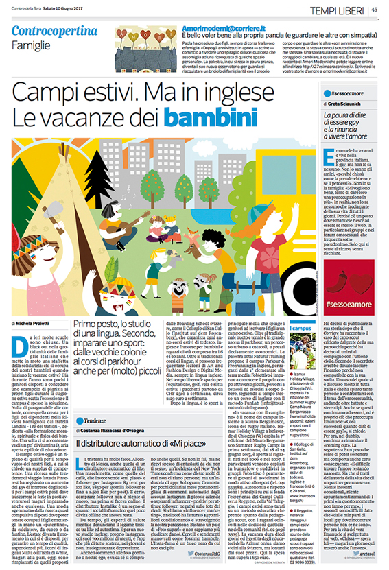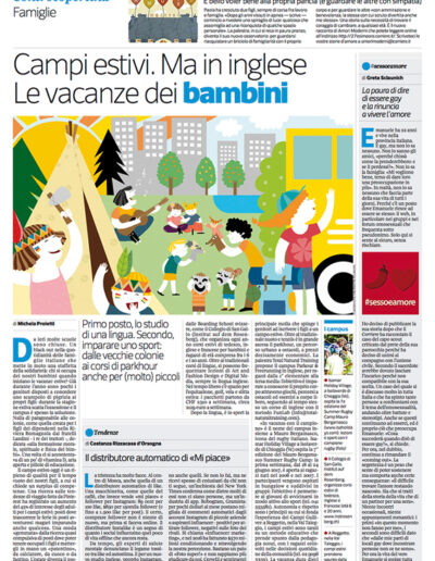 Commissioned by the Italian newspaper Il Corriere della Sera for its “Tempi Liberi” section, this artwork accompanies a feature on summer vacations and educational camps. The scene is rich with detail, depicting a variety of activities—from music and drama to outdoor exploration—set against a backdrop that bridges the natural and urban worlds. This project demonstrates my ability to create busy, engaging scenes with multiple characters that bring lifestyle and parenting topics to life for a global audience.