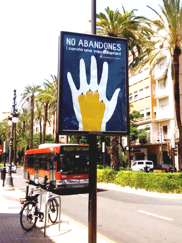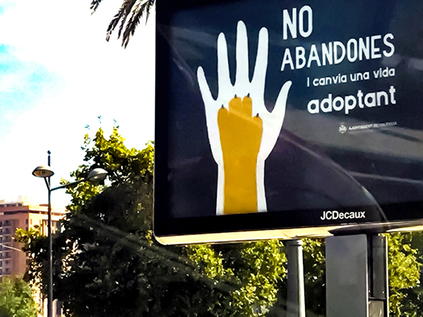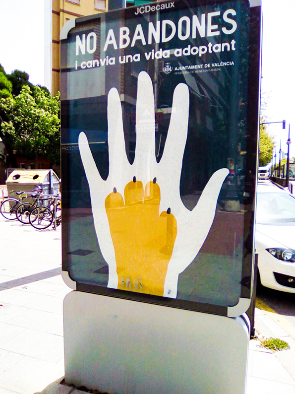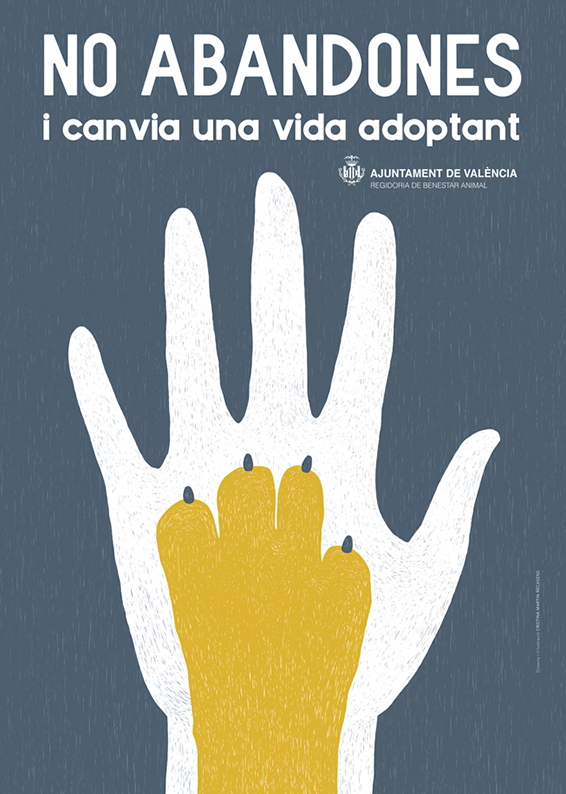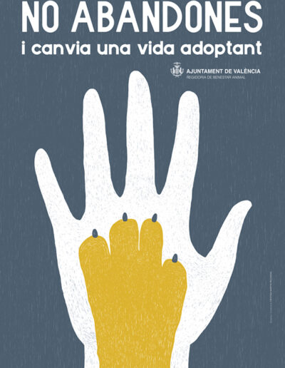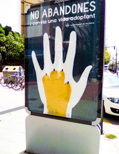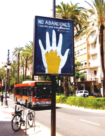 Commissioned by the City Hall of Valencia in 2017, this project shifts the narrative from the problem of abandonment to the positive solution of responsible adoption. The seamless integration of a human hand and an animal paw symbolizes an inseparable bond and mutual salvation. Designed for urban high visibility, the campaign uses a striking blue and yellow contrast to capture citizens’ attention on billboards and street mupis, encouraging a heartfelt commitment to animal welfare.