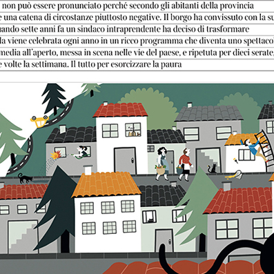 A whimsical and conceptual travel illustration for a feature on the Italian town of Colobraro and its unique reputation.