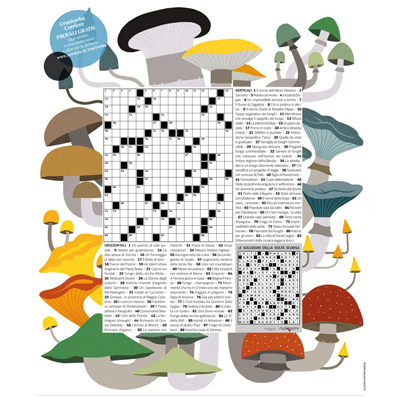 A whimsical and functional editorial illustration framing a crossword puzzle with an organic mushroom theme.
