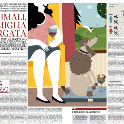 A sophisticated and humorous editorial illustration exploring the evolving role of pets in modern households.